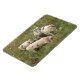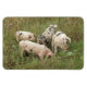 This awesome magnet features a beautiful photograph of a group of cute pigs in a field. Some of the pigs are rooting around in the earth while others look on.