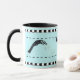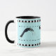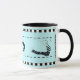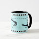 The trio of pilates figures circle a mug in black and white with a checked border. Background colour can be customised.