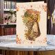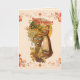 Thanksgiving card with a Pilgrim Girl with cornucopia and border of autumn leaves.