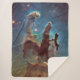 A space photo from NASA Hubble featuring the "Pillars of Creation" within the Eagle Nebula, or M16 on the large size Sherpa blanket. This image is dominated by shades of brown and teal blue with some green and orange. You can change the crop setting on this large blanket if you'd like to see more of the sparking "star". Here is a quote about why the different colours show up... "The colours in the image highlight emission from several chemical elements. Oxygen emission is blue, sulphur is orange, and hydrogen and nitrogen are green."