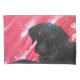 A red pillow case with a portrait of a young black Lab against a marble red background