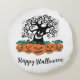 A decorative white pillow, ideal for Halloween decor, is placed on a textured, beige surface with a soft, white blanket partially visible on the side. The pillow features a Halloween-themed design with a spooky, gnarled tree at the top and a row of five grinning jack-o'-lanterns beneath it. The text "Happy Halloween" is elegantly written across the bottom. The design is both festive and slightly eerie, perfect for adding a Halloween touch to any room.