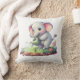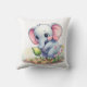 This is an image of a throw pillow with a cute cartoon elephant on it. The elephant is light grey with big pink ears and rosy cheeks. It's holding a small green watering can and watering tiny green sprouts in a garden bed. There are also small flowers and grass around the elephant