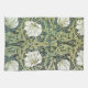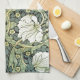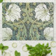 A kitchen towel with the floral pattern by the English artist William Morris (1834-1896) who influenced the Arts and Crafts movement, Pimpernel (1876). White poppies with green leaves and yellow pimpernel flowers.