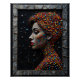 The entire composition creates an illusion of countless colorful pin heads shaping the portrait, set against a stark dark background—black or deep gray—to make the vibrant colors pop vividly. The border mimics a cracked marble or textured stone, embroidered with variegated gray, white, and earthy threads using chain stitch, split stitch, or couched lines to depict crack patterns, framing the intense mosaic of colors and textures. This piece combines playful, sculptural beauty with intricate craftsmanship, emphasizing rich texture, vibrant mosaic effects, and a unique, tactile visual impact."