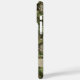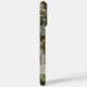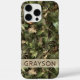 Customise this pine and leaves camouflage iPhone 16 pro max case with your name in a trendy modern CAP font in brown on opaque cream. It's masculine and perfect for your favourite military, hunting, country or outdoorsman!