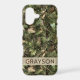 Customize this pine and leaves camouflage iPhone 17 case with your name in a trendy modern CAP font in brown on opaque cream. It's masculine and perfect for your favorite military, hunting, country or outdoorsman!