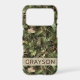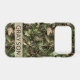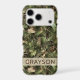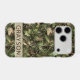 Customize this pine and leaves camouflage iPhone 17 pro case with your name in a trendy modern CAP font in brown on opaque cream. It's masculine and perfect for your favorite military, hunting, country or outdoorsman!