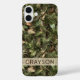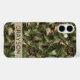 Customize this pine and leaves camouflage iPhone 16 plus case with your name in a trendy modern CAP font in brown on opaque cream. It's masculine and perfect for your favorite military, hunting, country or outdoorsman!