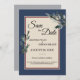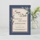 This Pine Blue Winter wedding save the date combines a classy, formal dusty blue framed border with elegant, evergreen pine tree boughs for a classic, yet rustic look. The botanical greenery foliage with calligraphy type over a beige background creates a nature focused vibe for a Christmas or forest destination marriage celebration.
