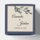 This Pine Blue Winter wedding square favour box combines a classy, formal dusty blue framed border with elegant, evergreen pine tree boughs for a classic, yet rustic look. The botanical greenery foliage with calligraphy type over a beige background creates a nature focused vibe for a Christmas or forest destination marriage celebration.
