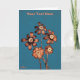 A slightly stylised, brown-and-orange image of five flowers made from pie cones on a neutral blue background. Add you own text.