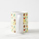 A mug with a cute pattern featuring pine cones and holly on a yellow watercolor background with little white circles scattered around.