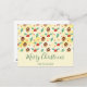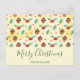 Christmas postcard with a cute pattern featuring pine cones and holly on a yellow watercolor background with little white circles scattered around.