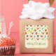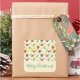 Merry Christmas stickers with a cute pattern featuring pine cones and holly on a yellow watercolor background with little white circles scattered around.