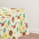 Tablecloth with a cute Christmas pattern featuring pine cones and holly on a yellow watercolor background with little white circles scattered around.