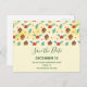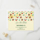 Save the date postcard with a cute pattern featuring pine cones and holly on a yellow watercolor background with little white circles scattered around.