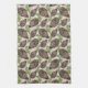 This kitchen dish towel features a repeating pattern of pine cones and pine branches.
