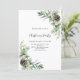 White background, decorated with pine tree cones, white berries, green leaves. Personalise and add your party details. Black letters.