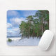 Panoramic view of pine trees forest near covered in snow sea coast during sunny winter day with blue sky with clouds.