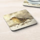 This set of cork coasters features a lively, cheerful Pine Siskin who seems to be talking although he has a sunflower seed in his mouth! He is standing in the snow on a sunny winter day illuminated by a golden light.