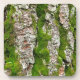 Vibrant green moss grows in vertical grooves of faded pine tree bark. The macro photograph shows the alternating stripes of bark and moss as well as the texture of each. The bark is layered, scaly, with fine gradations of colour: greys, browns, and even pale green. The moss is comprised of myriad short fine hairs, as though the tree wanted some green fur highlights.
