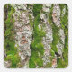 Vibrant green moss grows in vertical grooves of faded pine tree bark. The macro photograph shows the alternating stripes of bark and moss as well as the texture of each. The bark is layered, scaly, with fine gradations of colour: greys, browns, and even pale green. The moss is comprised of myriad short fine hairs, as though the tree wanted some green fur highlights.