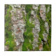 Vibrant green moss grows in vertical grooves of faded pine tree bark. The macro photograph shows the alternating stripes of bark and moss as well as the texture of each. The bark is layered, scaly, with fine gradations of colour: greys, browns, and even pale green. The moss is comprised of myriad short fine hairs, as though the tree wanted some green fur highlights.