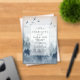 A soft serene watercolor wash of pine trees and birds flying above in soft hues of blue, for a frosted acrylic wedding invitation with rustic elegance. Available in print, as a digital download, or both.