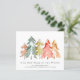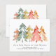 Budget-friendly simple and elegant moving announcement featuring a beautiful watercolor forest of abstract pine trees in muted green, red, gold and orange. On the front, personalise the "Our New Neck of the Woods" text, your family name and your new address. On the reverse side you can personalise your announcement in more detail and include telephone numbers and email addresses if desired.