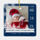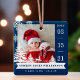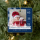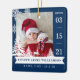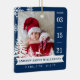New baby birth stats photo Christmas ornament. The design features two photos, one photo on the front and one on the back. Display your new baby's photo. The date of birth is displayed along the side and the baby's name and birth stats along the bottom. A navy blue background with white snowflakes, pine trees, and deer is added along the bottom of the photo. **Please note you can change the background colour by clicking on edit using the design tool. The reverse side features a place to add a second photo. White snowflakes, trees, and deer are added as well. design by Moodthology Papery