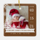 New baby birth stats photo Christmas ornament. The design features two photos, one photo on the front and one on the back. Display your new baby's photo. The date of birth is displayed along the side and the baby's name and birth stats along the bottom. A brown background with white snowflakes, pine trees, and deer is added along the bottom of the photo. **Please note you can change the background colour by clicking on edit using the design tool. The reverse side features a place to add a second photo. White snowflakes, trees, and deer are added as well. design by Moodthology Papery