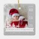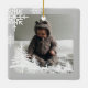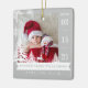 New baby birth stats photo Christmas ornament. The design features two photos, one photo on the front and one on the back. Display your new baby's photo. The date of birth is displayed along the side and the baby's name and birth stats along the bottom. A Grey background with white snowflakes, pine trees, and deer is added along the bottom of the photo. **Please note you can change the background colour by clicking on edit using the design tool. The reverse side features a place to add a second photo. White snowflakes, trees, and deer are added as well. design by Moodthology Papery