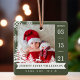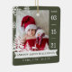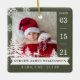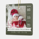 New baby birth stats photo Christmas ornament. The design features two photos, one photo on the front and one on the back. Display your new baby's photo. The date of birth is displayed along the side and the baby's name and birth stats along the bottom. A green background with white snowflakes, pine trees, and deer is added along the bottom of the photo. **Please note you can change the background colour by clicking on edit using the design tool. The reverse side features a place to add a second photo. White snowflakes, trees, and deer are added as well. design by Moodthology Papery