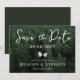 A rustic Save the Date card featuring a scenic green forest photo background by Destei and elegant script text reading “Save the Date.” The date is prominently displayed above two delicate pinecone silhouettes that add a charming woodland touch. Below, a classic line invites guests to the wedding of the couple with space for names and a note that a formal invitation will follow. The back of the card showcases a green background with matching pinecone silhouettes framing a personalizable area for the couple’s initials and wedding date. Perfect for nature-loving couples planning a rustic, outdoor, hiking or forest-themed wedding.