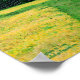 Colourful field filled with yellow flowers bordered by tall green pine trees poster. Nature photography by Susan.