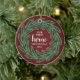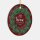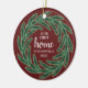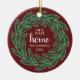 Pine Wreath Red Green Personalised Our First Home Ceramic Ornament. Personalise with your custom information on both front and back.
