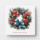 A plaque with a pretty Christmas wreath. A festive image with a pine wreath decorated with red flowers, holly and a lovely blue bow. Delightful.