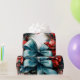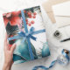 Wrapping paper with a pretty Christmas wreath. A festive image with a pine wreath decorated with red flowers, holly and a lovely blue bow. Delightful.