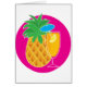 A pineapple with a green top, is on a cyan background. In the foreground, there is a pineapple cocktail in a tall stemmed glass, with a lemon wedge and tiny blue umbrella.