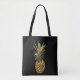 This beautiful tote bag displays a ripe, juicy golden brown pineapple with spiny green leaves set on a black background.
