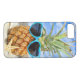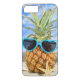 tropical pineapple in heart shaped sunglasses in sand with seashell and starfish