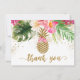 This summery bridal shower thank you card has beautiful tropical watercolor flowers with faux gold glitter confetti and a faux gold glitter pineapple. Coordinating gold calligraphy compliments the lovely floral design.