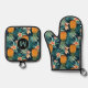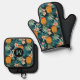 This attractive oven mitt and pot holder set has a tropical pineapple, flower, and leaves design. Colours include brown orange, teal green, and soft pink on a black background. The pot holder has your monogram in matching teal on a circle banner. Bright and colourful!