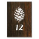 A wedding table number place card featuring a pine cone illustration over a barnwood inspired background.