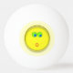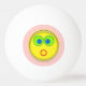 Three dimensional looking yellow sun is in centre of the each side of ball. On one side, a wary look is depicted with green eyes looking to one side and a small a red mouth at the bottom, background is a light yellow.On other side, a shocked look is depicted with large green eyes looking towards the centre and the red mouth open very widely, background is a light pink.