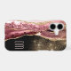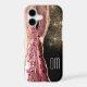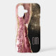 This pretty phone case features a pink, burgundy, and gold glitter abstract agate like pattern on the left side, and your monogram in matching pink against a black background on the right. At the top is an overlay of tiny gold star shine faux glitter. Unique and eye-catching!