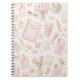This elegant pink aesthetic journal cover features a soft watercolor collage of roses, makeup essentials, perfume bottles, bows, candles, and latte art—perfect for anyone who loves feminine, glamorous stationery. The delicate pastel palette and charming beauty accessories create a chic, stylish look for planners, notebooks, and custom journals.