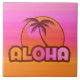 Hawaiian design featuring a palm tree and sunset in shades of pink and orange. Retro style text says ALOHA. Pink and orange gradient background. Keep that vacation feeling all year long. PinkInkArt original!