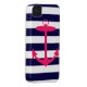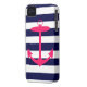 A bright, neon pink silhouette of an anchor is on a navy blue and white striped background. A fun, nautical design.